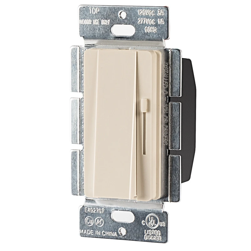 Use this 0-10V LED switch and slide dimmer on LED fixtures, such as panels and high-bay lights, with 0-10V dimming capabilities. It has a paddle for on/off functionality and a small slider for dimming. Use the 3-way switch to control lights from two locations. Integrated high- and low-end trim adjustment dials allow access to the lowest and highest light levels without flickering. The dimmer is rated for six amps at 120 VAC or three amps at 277 VAC (amps = fixture wattage/voltage).