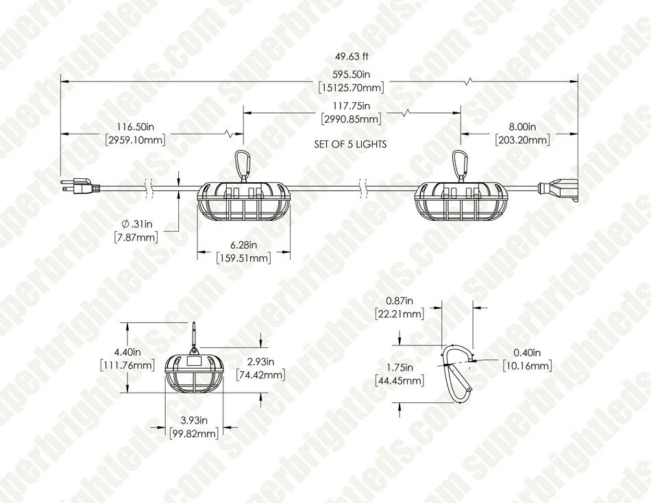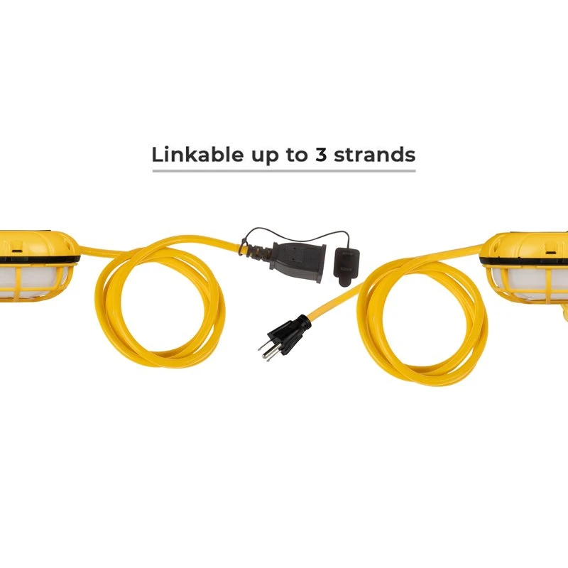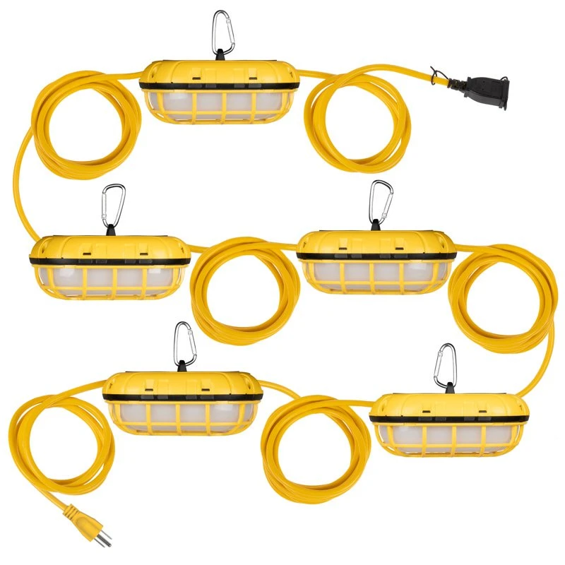 The 125W LED Temporary String Work Light provides 15,625 lumens for workplaces, construction sites, garages, or emergency scenes. The 50ft 5 bulb string has LED lamps spaced 10ft apart for a wide distribution of light. The polycarbonate housing and lens protects the LEDs from dust and water. Hang the LED fixtures using the included carabiners, and link up to 3 separate 50ft strings. Suitable for both indoor and outdoor usage.