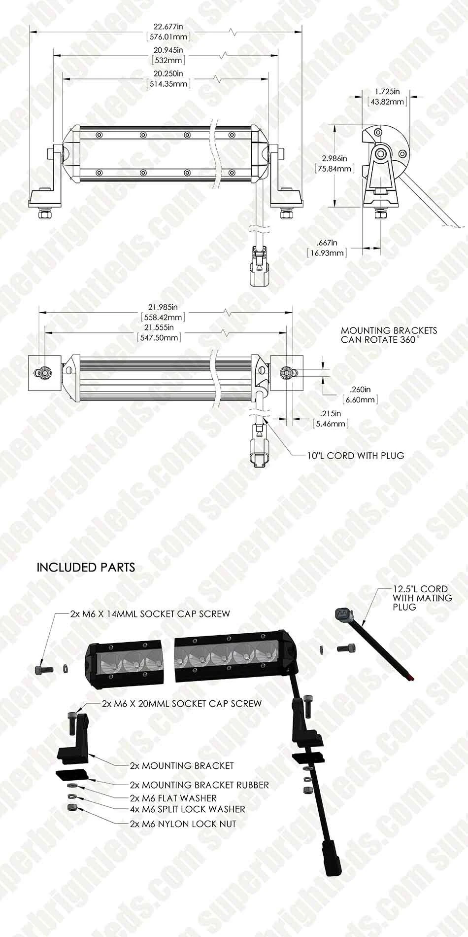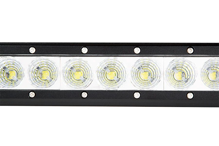 This Hyper series LED light bar has a single row of 18 LEDs that produce 3,024 raw lumens of cool white light in a 60° beam pattern. Durable and water resistant, the bar is built from an aluminum housing with a polycarbonate lens. The integral heat sink keeps the LEDs running cool, adding to their long life. Adjustable mounting brackets and installation hardware are included along with a 10” power wire.