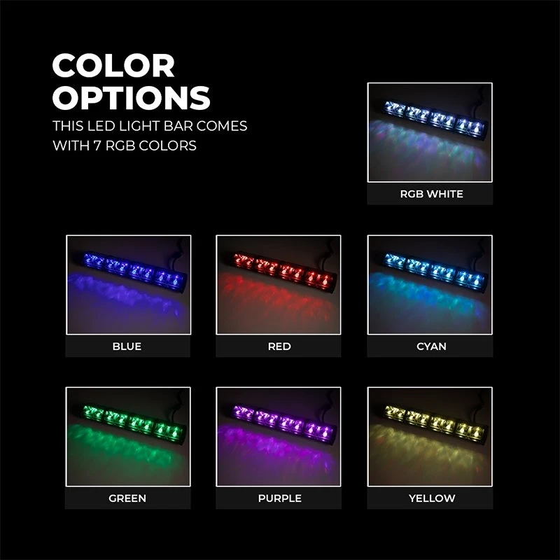 - Integrated controller cycles through 7 RGB colors, 6 adjustable beam angles, driving beam on/off, power on/off