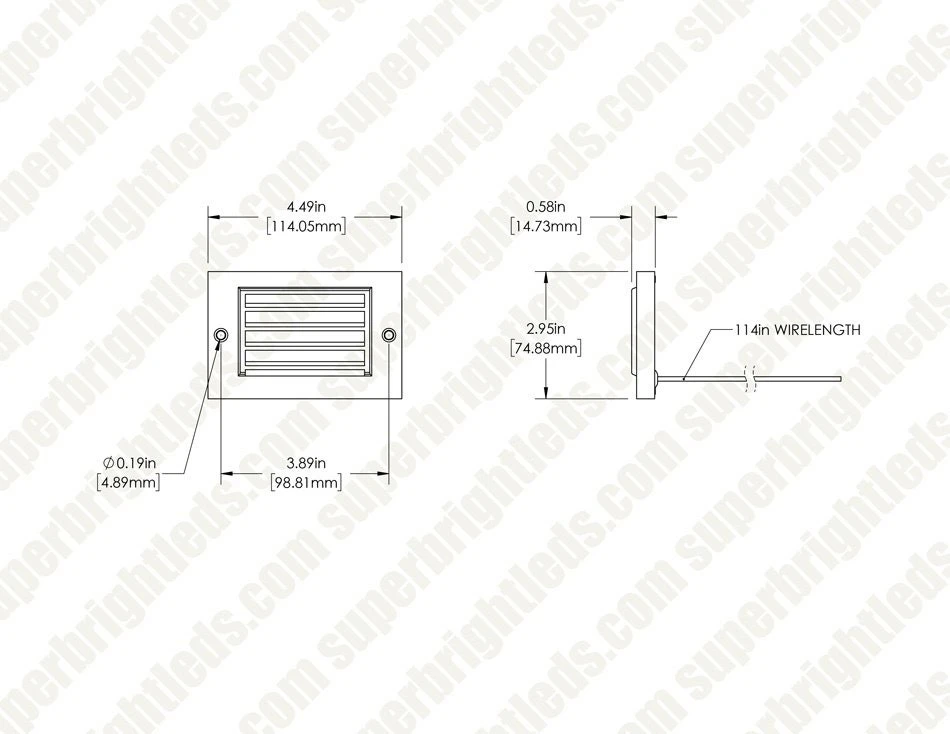 The 2W low-voltage brass landscape LED step light adds 60 lumens of accent and safety lighting to your steps or deck walkways. Use the included screws to flush mount the light without cutting into the mounting surface. The thin, solid brass faceplate has a louvered front that directs light down, reducing glare. The brass is durable and corrosion-resistant with a brushed bronze finish. Sealed internal components provide an IP65 waterproof rating, ideal for outdoor use. Power the step light by wiring it to your existing 12V electrical system or use an optional low-voltage transformer. Approximate dimensions: 4.5″ x 3″