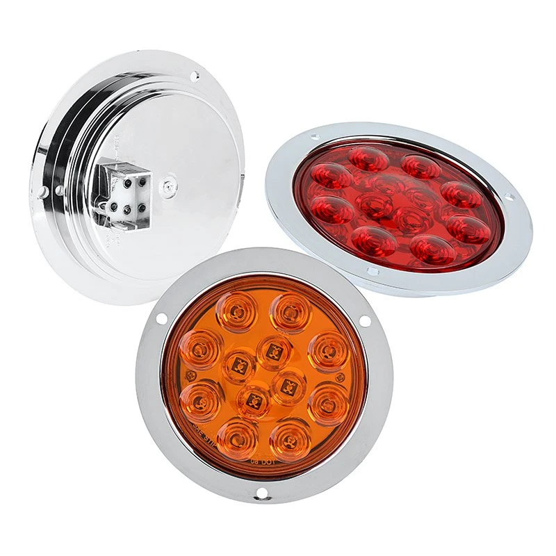 Designed to accept industry standard 3-pin plugs, this 4” round LED light meets DOT FMVSS 108 requirements for use as parking lights, turn signal lights, hazard warning lights, brake lights, and tail lights. The light mounts flush with the built-in plastic 3-hole mounting flange. Each light boasts 12 high-flux LEDs that operate with in a wide 9-14.8V DC range and consumes 90% less energy than incandescent lamps. Sonically sealed polycarbonate lens and weatherproof housing. The truck/trailer lights are available in amber, red, or white; white lamps are single intensity. Lifetime warranty on all truck/trailer lights.