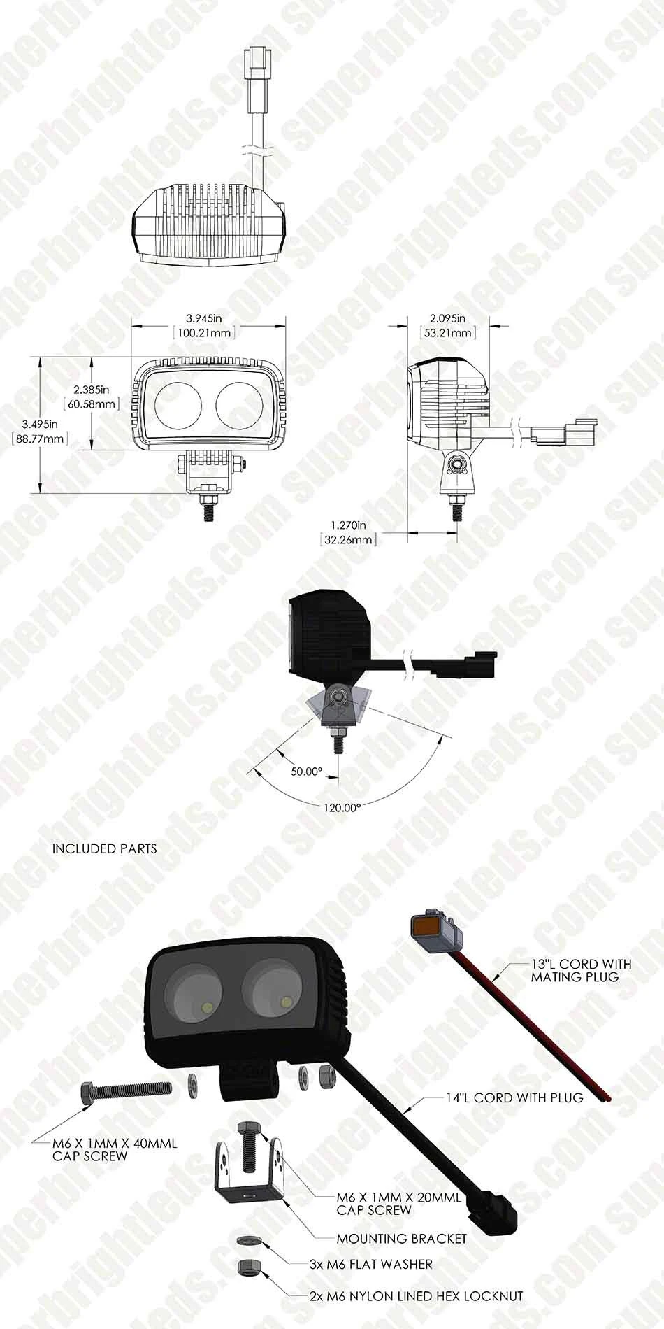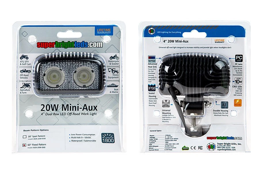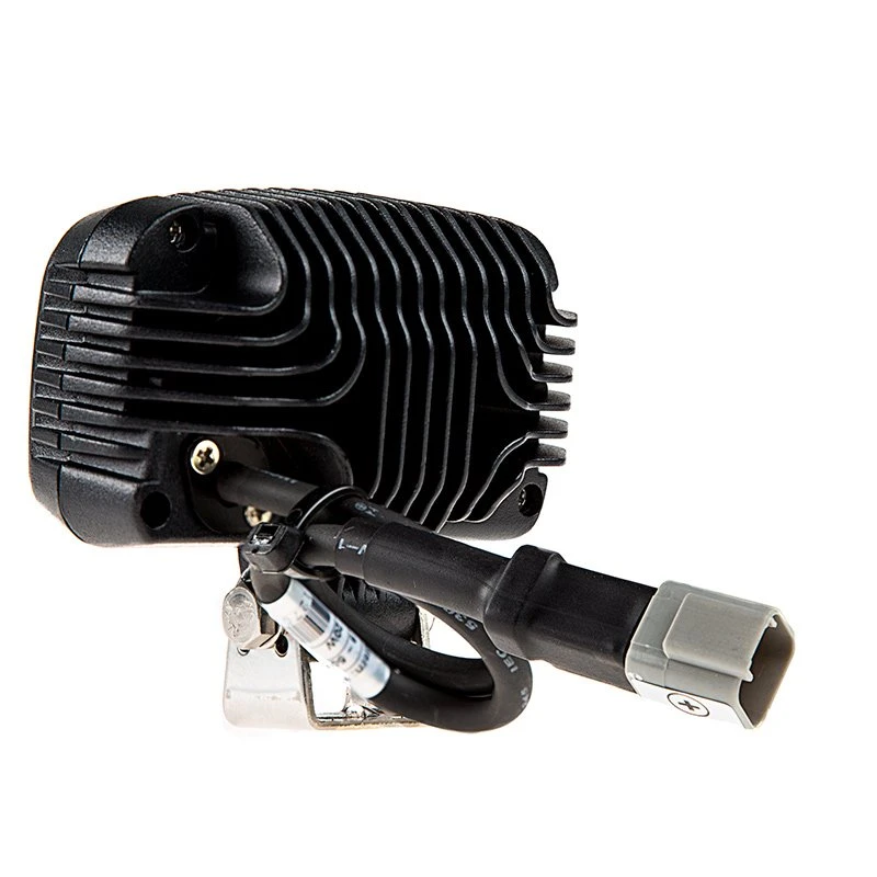 Off-Road 4” dual LED work light provides 1,800 lumens of high-powered cool white light, and available with a 30° narrow spot or 60° wide flood beam pattern. The sealed aluminum housing and polycarbonate lens keep the internal components dry even in extreme weather. Includes an adjustable mounting bracket with 12″ wire lead and a 12″ sealed DT pigtail adapter.
