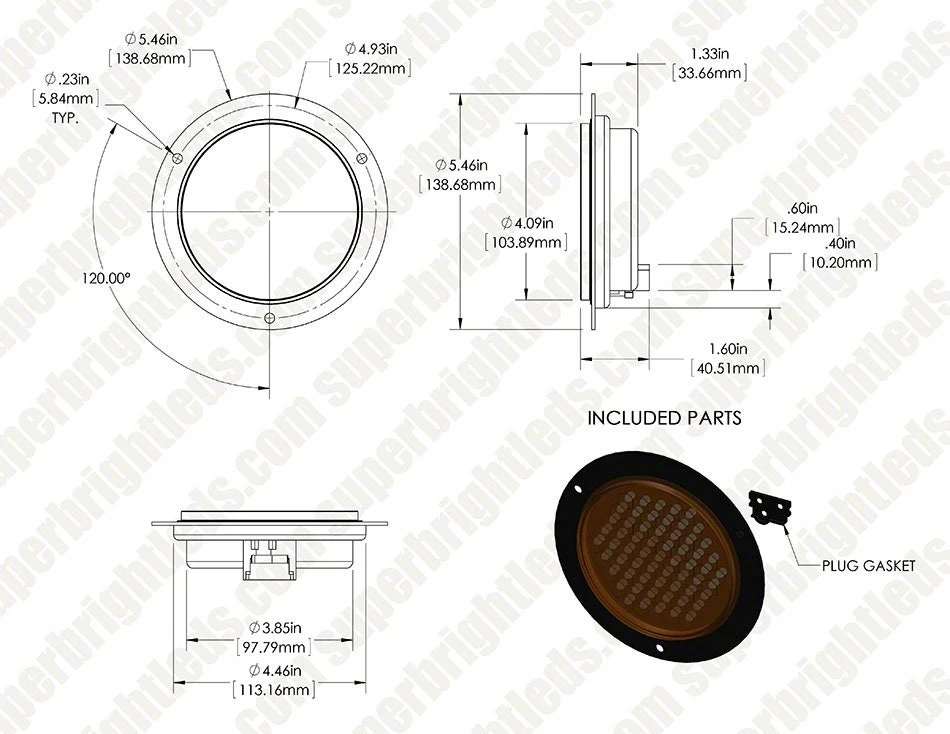 Designed to accept industry-standard 3-pin plugs, this 5-1/2” round LED light meets DOT FMVSS 108 requirements for use as parking lights, turn signals, hazard warning lights, brake lights, and tail lights. The light mounts flush with the built-in black PVC 4-hole mounting flange. Each light boasts 61 LEDs operating within a wide 9-14.8V DC range and consumes 90% less energy than incandescent lamps. Sonically sealed polycarbonate lens and weatherproof housing. The truck/trailer lights are available in red or amber. Lifetime warranty on all truck/trailer lights. Dimensions: 5.46″(13.87cm) x 1.6″(4.05cnm) x 5.46″(13.87cm)