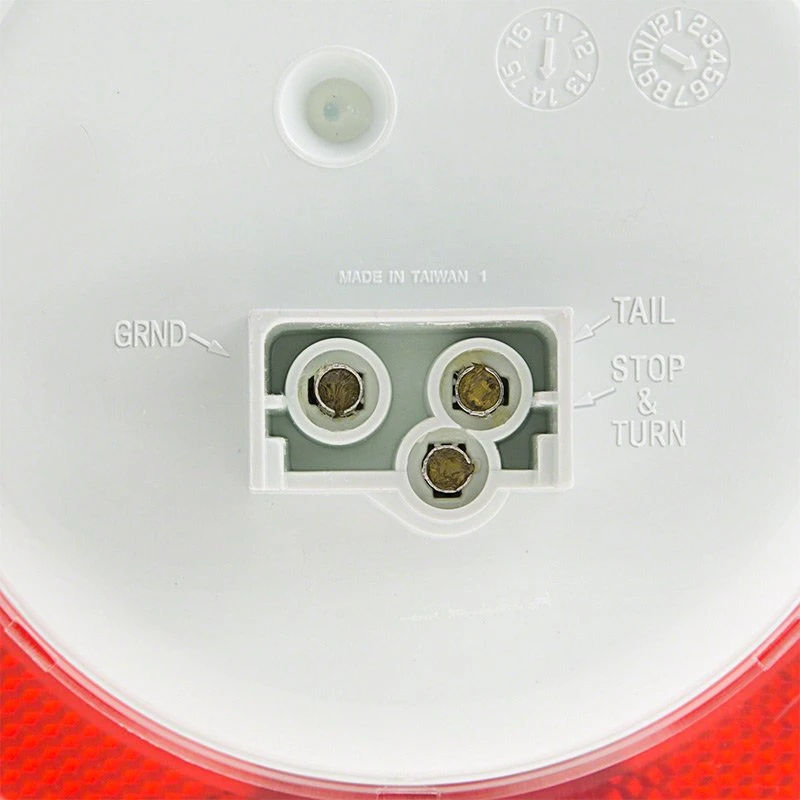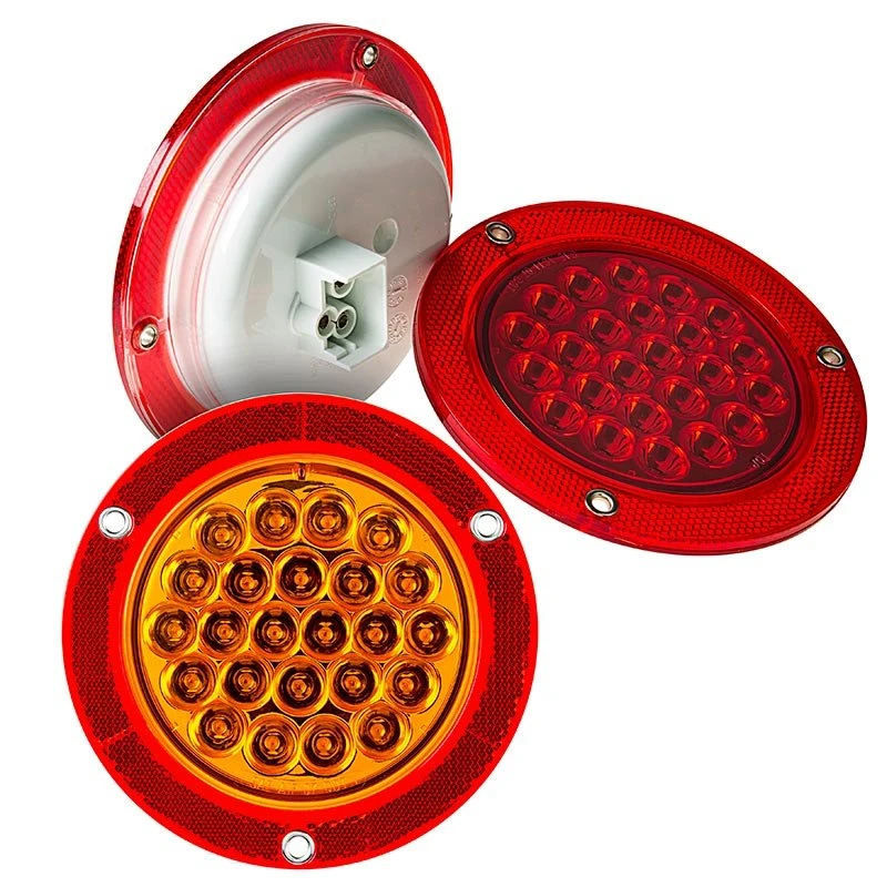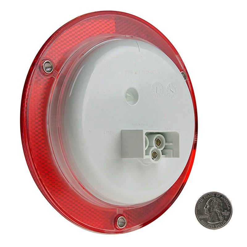 This 5-1/2″ round 24 LED light with reflector flange meets DOT FMVSS 108 requirements for use as parking lights, reverse or backup lights, side reflectors, brake lights, turn signal lights, hazard lights, and tail lights. The light has a sonically sealed polycarbonate lens and weatherproof housing for harsh outdoor conditions. Flush mounts easily the included 3-hole flange and a 3-pin connector to provide stop, turn, or tail lights on vehicles (see accessories). Dimensions: 5.46”(13.87cm) x 1.34”(3.41cm).