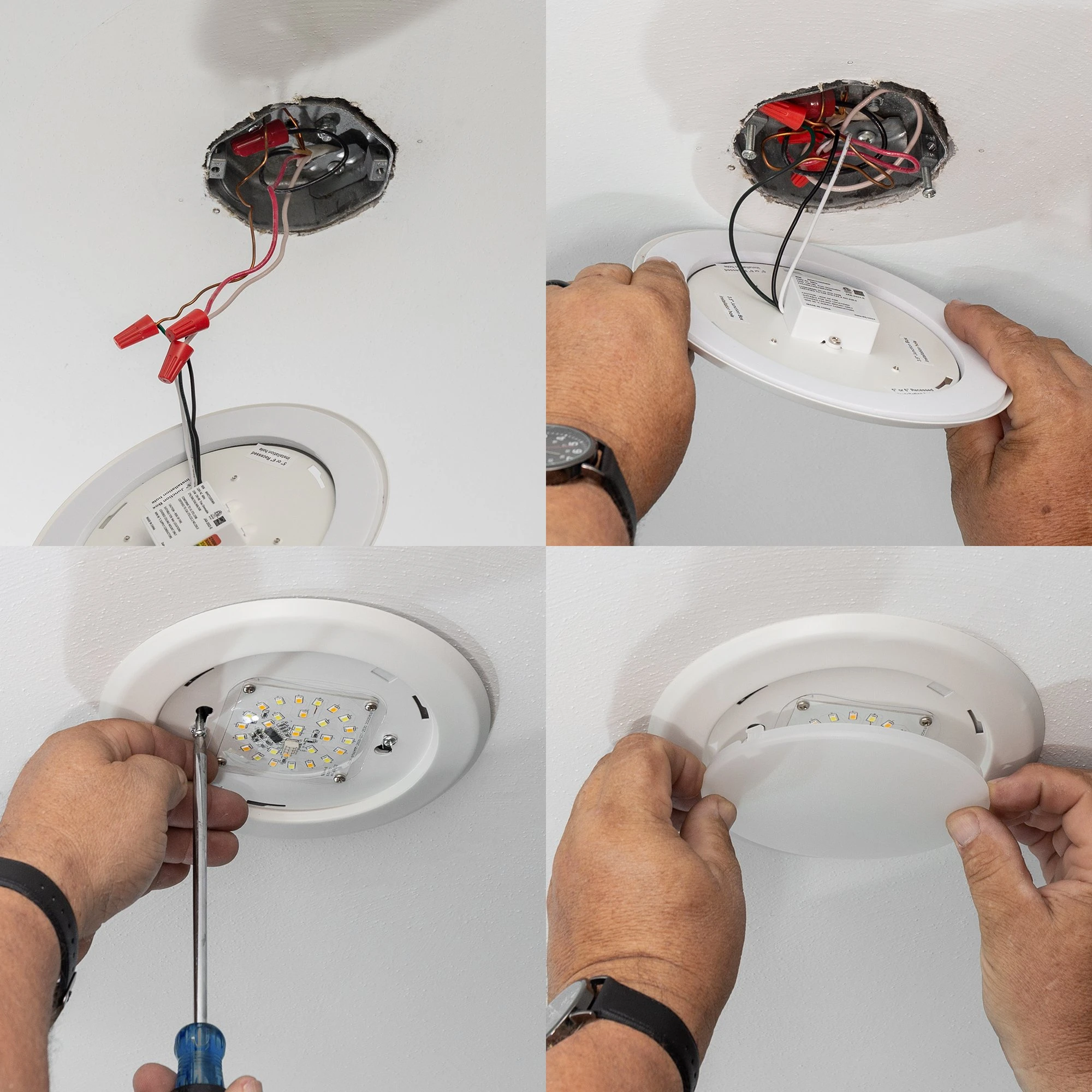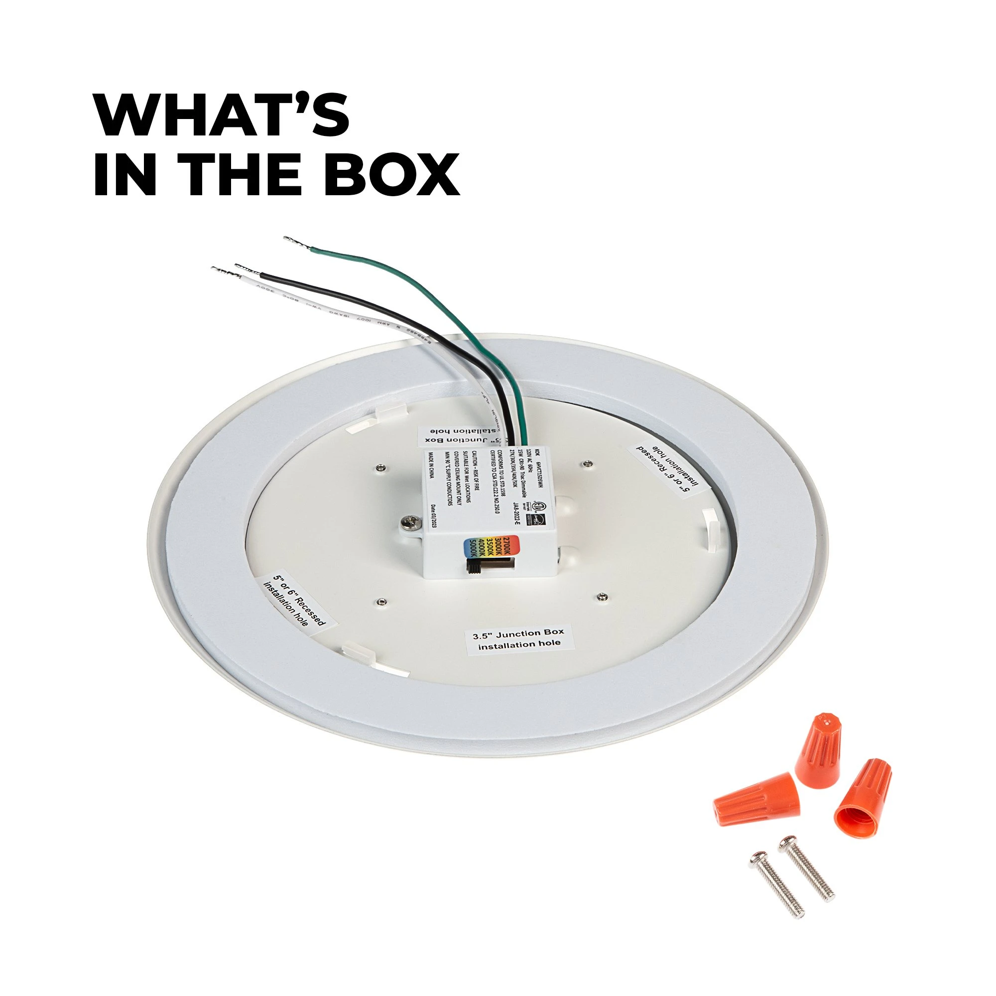 The 7″ 15W LED flush mount downlight features a selectable color temperature letting you match the light to your new or existing lighting design. A simple switch lets you choose 2700K, 3000K, 3500K, 4000K, or 5000K during installation. The dimmable 15-watt ceiling light is equivalent to a 75W halogen delivering up to 1,125 lumens. A round polycarbonate lens diffuses light for even illumination. Ideal for new construction and remodeling applications. Use the included bracket and hardware to flush mount to a surface or junction box in your kitchen, bathroom, or hallway.Â