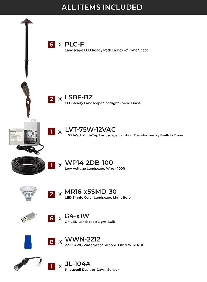 Compiled of two types of fixtures, this landscape kit offers a more diverse array of lighting for outdoor spaces. Six cone shade path lights ensure an illuminated walkway or garden, while the two spotlights can accent particular architecture, trees, or other features. Simply apply the G4 or MR16 bulb into the corresponding fixture, and use included hardware to add to outdoor landscapes. 75W Stainless Steel Transformer is low voltage and compatible with included photocell sensor. Wire and twist-on wire connectors complete the set, for a total landscape illumination package.