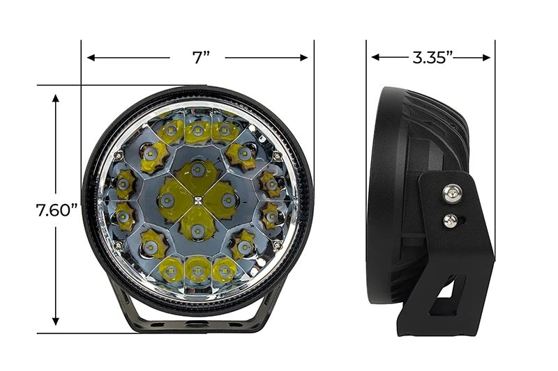 OR series 7″ LED Work Light projects a powerful beam with high speed visibility and maximum forward distance. Supplement wider beam driving lights and illuminate farther down a trail or road with this long-range spot light. It throws a narrow 4° beam pattern over half a mile, to penetrate dark off-road or rough work environments. Heavy duty construction includes die-cast aluminum housing and polycarbonate lens, sealed against moisture and impact-resistant. Mounting brackets and hardware are included for quick, secure installation on powersports, security and law enforcement vehicles, trucks, boats, and more.
