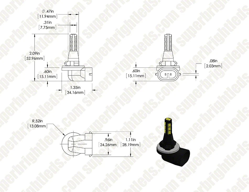 This 881 LED daytime running light bulb replaces traditional 881 halogen and xenon bulbs. It has 27 LEDs (4014 SMD). The radially mounted LEDs emit a 360° viewing angle that illuminates the DRL reflective housing to set a vehicle apart from its surroundings. Error-free LED bulbs are designed to communicate with your vehicle’s CAN Bus computer system and prevent error messages. Tower-style design with 881 base for easy plug-and-play installation. The energy-efficient bulb operates with in a wide 9-14.5V DC range with surge protection up to 18 volts and is designed to last 30,000 hours on your car, truck, SUV, or van—25 times longer than incandescent bulbs. Cool white color. Not sold in pairs. Price per bulb.