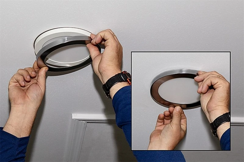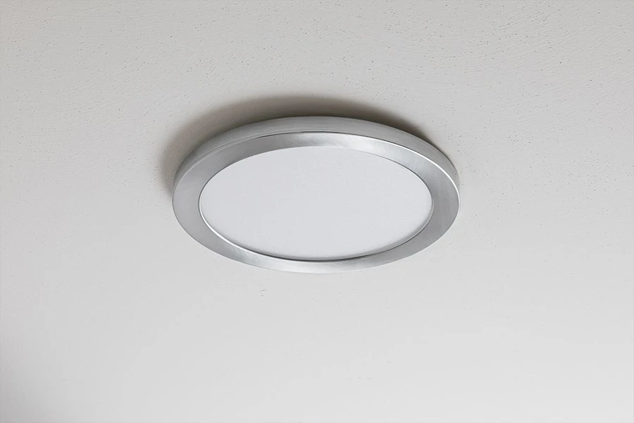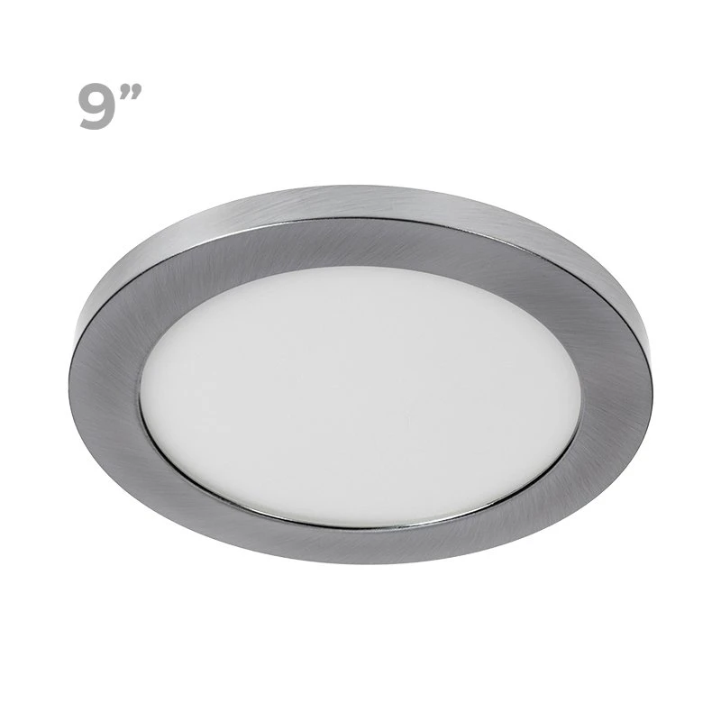 The low-profile dimmable 9″ downlight features a magnetic base with removable satin nickel trim. The light is customizable with optional trim rings to match your decor. Equivalent to 100W incandescent fixtures, it is ideal for new construction, remodeling, and retrofit applications. At 18W, the downlight delivers 1,440 lumens and is well-suited for use in kitchens, closets, hallways, and more. The included bracket and hardware flush mount directly to a junction box. For existing can light housing, use an optional 4″ or 5/6″ can light conversion kit (see accessories).