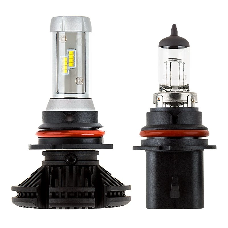 Increase your safety and visibility with this 9007 LED headlight/fog light kit. Each dual-intensity LED headlight bulb comes with a glass sleeve and adhesive film options for changing the bulb’s color temperature. The bulbs emit 5,000 lumens of cool white illumination per set (2,500 each) but can emit amber or cool white light by using the sleeve and one of the optional film choices. These bulbs feature 3rd generation cooling technology. They have compact heat sinks instead of short-lived fans or bulky braided heat sinks. This allows for a longer-lasting bulb that’s easier to install in tight spaces. The LED headlight bulbs last 13 times longer than halogen bulbs. LED arrays in each bulb are designed to mimic the filament in halogen bulbs—creating a closely matched beam style. These CAN Bus compatible bulbs operate on 9-32 VDC. The long-lasting kit includes 2 LED headlight bulbs, 2 9007 adapter plugs with drivers, 2 glass sleeves, 8 cool white and amber film sleeve covers, and mounting accessories. Bulbs have been environmentally tested with film and sleeve installed. Film can be removed but not reused. Use glass cleaner on the included sleeve before applying another piece of film. Price per kit.