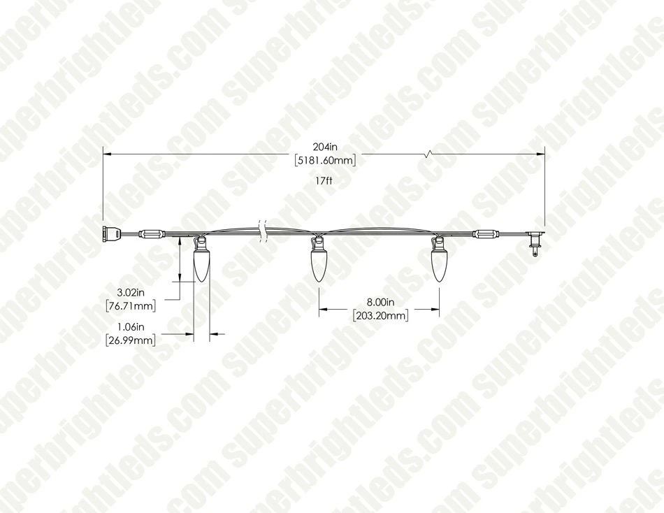 These C9 LED Christmas string lights have 25 faceted bulbs, with a retro bulb shape and slimmer base for a more modern finish. Connect up to 85 strands together, and hang them using the built-in clip on each bulb. The 17′ strands (16′ lighted length) have 8″ bulb spacing, green wire, and are individually fused to prevent multiple blown strands in the event of a power overload. These LED string lights consume 90% less energy than traditional incandescent strands and last 25 times longer. Each shatterproof bulb is made into the strand (not removable), which eliminates the chance of corrosion. Use these string lights indoors or out for anything from Christmas, Halloween, and Valentine’s Day to party and patio lighting. Strands are available in red, yellow, orange, blue, purple, green, warm white, and cool white colors.