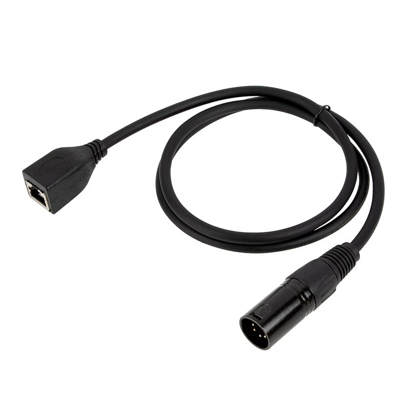 The DMX signal cable is designed to adapt a 5-pin XLR output to an RJ45 input, preventing lossless transmission of signal. The 1m cable is constructed of a shielded copper cable and zinc alloy connectors for secure connectivity and no interference.