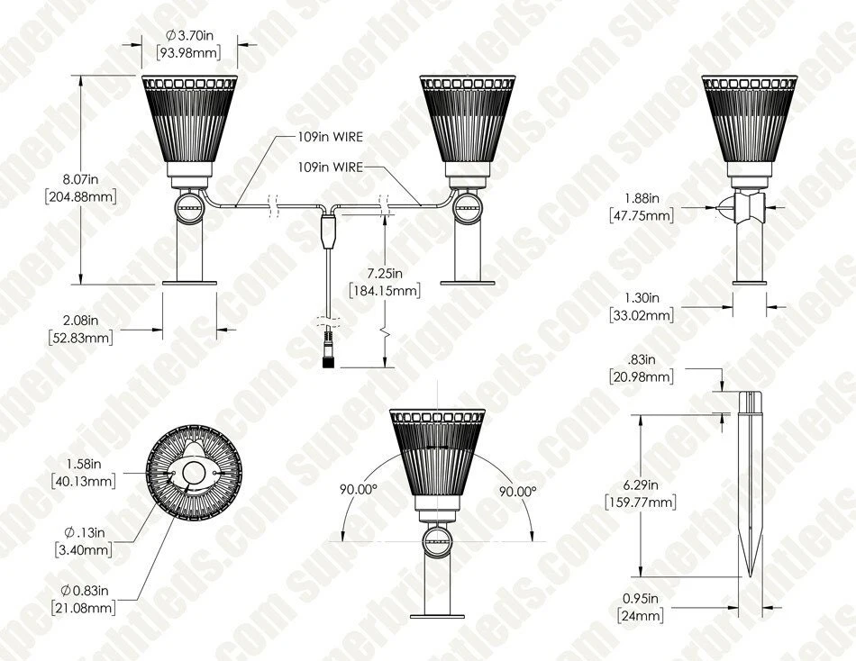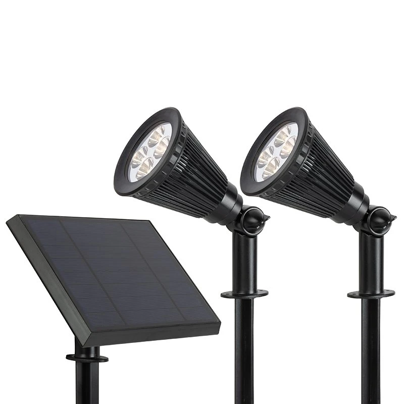 The dual solar spot light kit pairs a solar panel with two 60-degree LED spot light heads. Once fully charged, the dual-head spot light is ready for use. A switch turns the light on for automatic dusk-to-dawn operation and controls the outputs. Both heads have a high and low output, 45 lumens and 23 lumens, for a maximum of up to 90 lumens total. Full charge is reached in 4 to 6 hours with up to a 6-hour run time on high and 12 hours on low. The heads have 180-degree adjustable bases and ten-foot wire leads that connect to the photocell via a weatherproof connector. The panel is adjustable to 160 degrees. Use the included ground stakes for mounting or surface mount with included stainless steel screws. The dual-head solar spot light is IP45-rated weatherproof. Ideal for landscapes and architectural lighting.