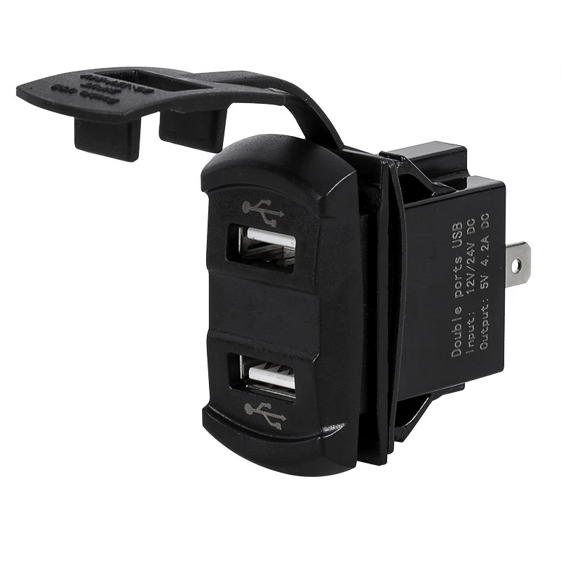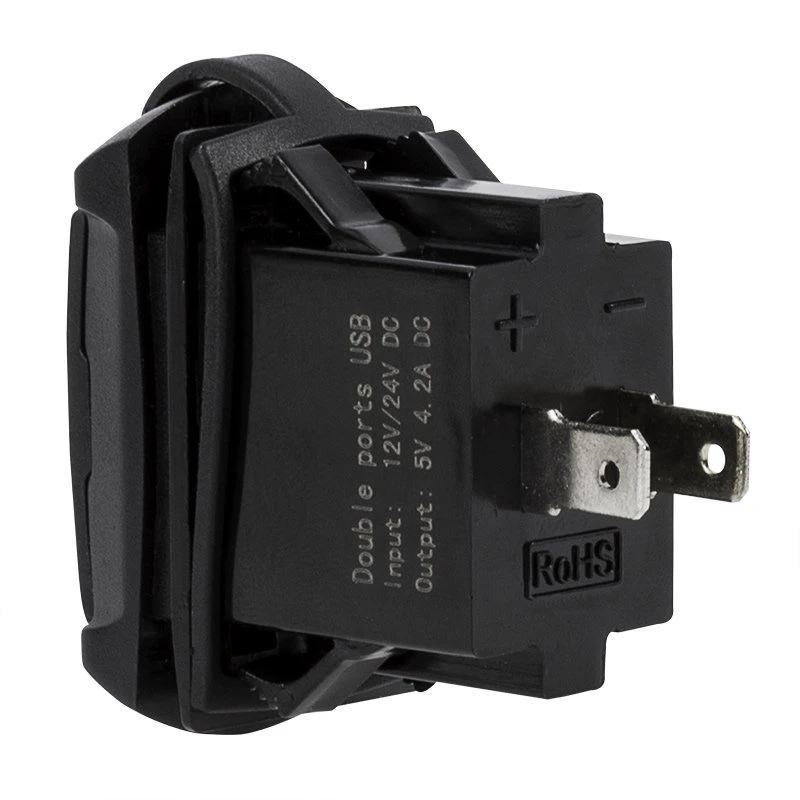 This Dual USB Charging Port Adapter lets you charge your cell phone, tablet, iPod, or other device and is designed to fit in rectangular switch panel openings. The port adapter has a built-in digital voltmeter to show vehicle battery voltage (8-24V display range) and ammeter to show amperage drawn from each USB device. The 12-24 VDC USB charger has a total output of 4.2 amps (2.1 amps from each port) at 5 volts. It has (2) 1/4″ male contact terminals to be used with 1/4″ female push-on connectors. The sealed, watertight USB rocker switch adapter easily installs in industry standard panel cutouts with the included rubber gasket. Modular switch brackets are available for single-switch mounting in a 0.83″ x 1.45″ hole.