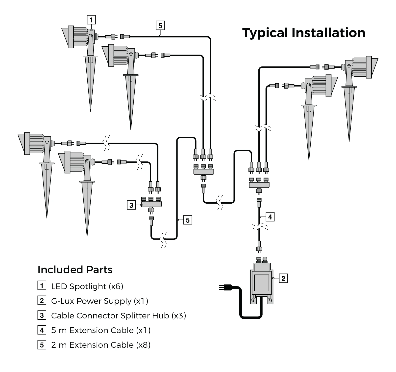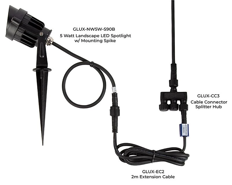 All the plug-and-play benefits of G-Lux Landscape Lighting in one complete kit. The 5-watt LED Spotlights are equivalent to 25-watt incandescent, requiring far less energy. with a rotatable head, mounting spike, and durable black aluminum, this light can provide versatile illumination for outdoor settings such as gardens, patios, and architecture. Run power to the LEDs with G-LUX series 12 AC Power Supply, using the extension cables and cable connector splitter hubs to complete the landscape lighting system. The entire bundle is weatherproof, ready to provide quality accent or visibility to pathways, signs, and more.