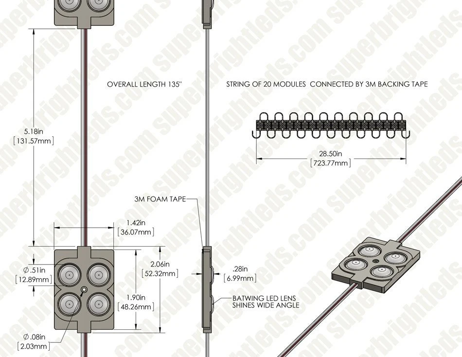 These single-color LED light modules provide consistent illumination for channel letters, sign lighting, under-cabinet lighting, store window lighting, and display case lighting. Modules are available in 80-packs or 20-packs that are stranded together upon purchase. The 22-gauge wire is polarity sensitive; red striped wire is positive, and white wire is negative. Each LED module has 4 LEDs. The LED emits a wide 160° beam pattern. Double-sided 3M adhesive foam tape is also included on the back of the module for secure mounting. The weatherproof module is constant-current driven with 12V DC operation and is designed to last 22,000 hours.