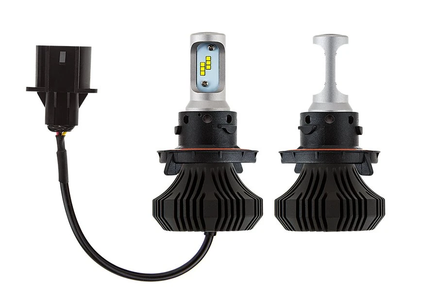 Increase your safety and visibility with this H13 LED headlight/fog light kit. The dual-intensity LED headlight bulbs emit 4,000 lumens of cool white illumination per set (2,000 lumens each) and feature 3rd generation cooling technology. They have integrated heat sinks instead of short-lived fans or bulky braided heat sinks. This allows for a longer-lasting bulb and easier installation in tight spaces. They also have internal drivers, which eliminates the need to mount an additional part and locate an appropriate mounting spot. The compact bulbs last 13 times longer than halogen bulbs. LED arrays in each bulb are designed to mimic the filament in halogen bulbs—creating a closely matched beam style. Each headlight bulb has 2 rows of LEDs that are activated individually for high- or low-beam settings. Only 1 row of LEDs is in use at any given time, and intensity is the same for both sets. These waterproof, CAN Bus compatible bulbs operate with in a wide 9-32 VDC range. This long-lasting kit includes 2 LED headlight bulbs and 2 adapter plugs. Price per kit.