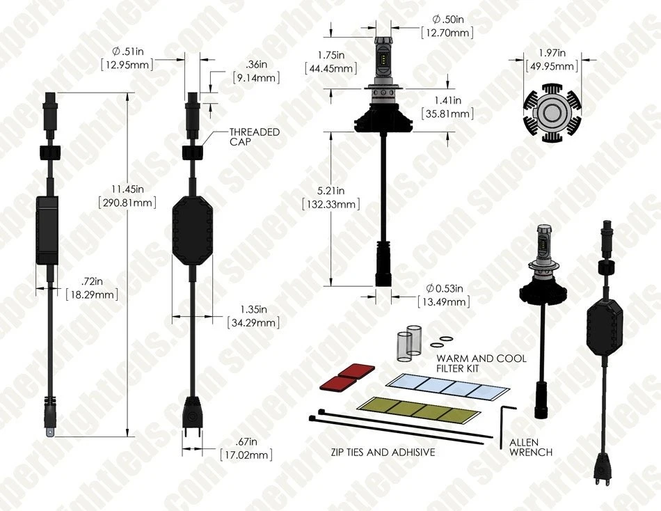 Increase your safety and visibility with this H7 LED headlight/fog light kit. Each single-intensity LED headlight bulb comes with a glass sleeve and adhesive film options for changing the bulb’s color temperature. The bulbs emit 5,000 lumens of natural white illumination per set (2,500 each) but can emit yellow or cool white light by using the sleeve and one of the optional film choices. These bulbs feature 3rd generation cooling technology. They have compact heat sinks instead of short-lived fans or bulky braided heat sinks. This allows for a longer-lasting bulb that’s easier to install in tight spaces. The LED headlight bulbs last 13 times longer than halogen bulbs. LED arrays in each bulb are designed to mimic the filament in halogen bulbs—creating a closely matched beam style. These CAN Bus compatible bulbs operate on 9-32 VDC. The long-lasting kit includes 2 LED headlight bulbs, 2 H7 adapter plugs with drivers, 2 glass sleeves, 8 cool white and yellow film sleeve covers, and mounting accessories. Bulbs have been environmentally tested with film and sleeve installed. Film can be removed but not reused. Use glass cleaner on the included sleeve before applying another piece of film. Price per kit.