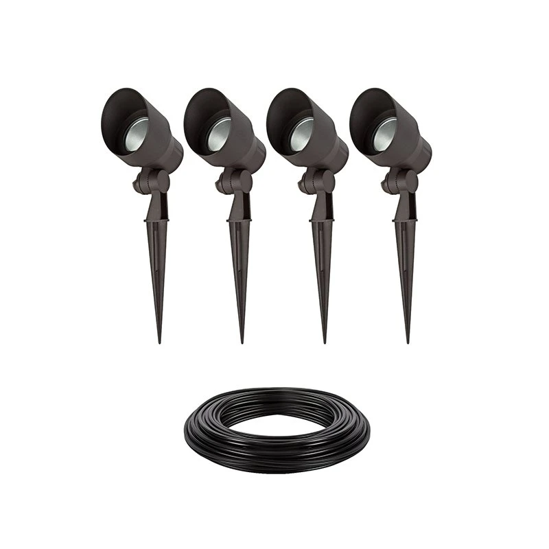 Complete with 4 Spotlights, 50′ of low-voltage landscape wire, and 4 waterproof wire nuts, extend the reach of existing landscape lighting with this kit. Provide brighter accent on architectural features, more tree uplights, and more with this set. The spotlights each have integrated LEDs, set on a 6″ mounting spike, and are finished in a bronze powder coating. Included wire and wire nuts allow for quick convenient connections that resist the elements.