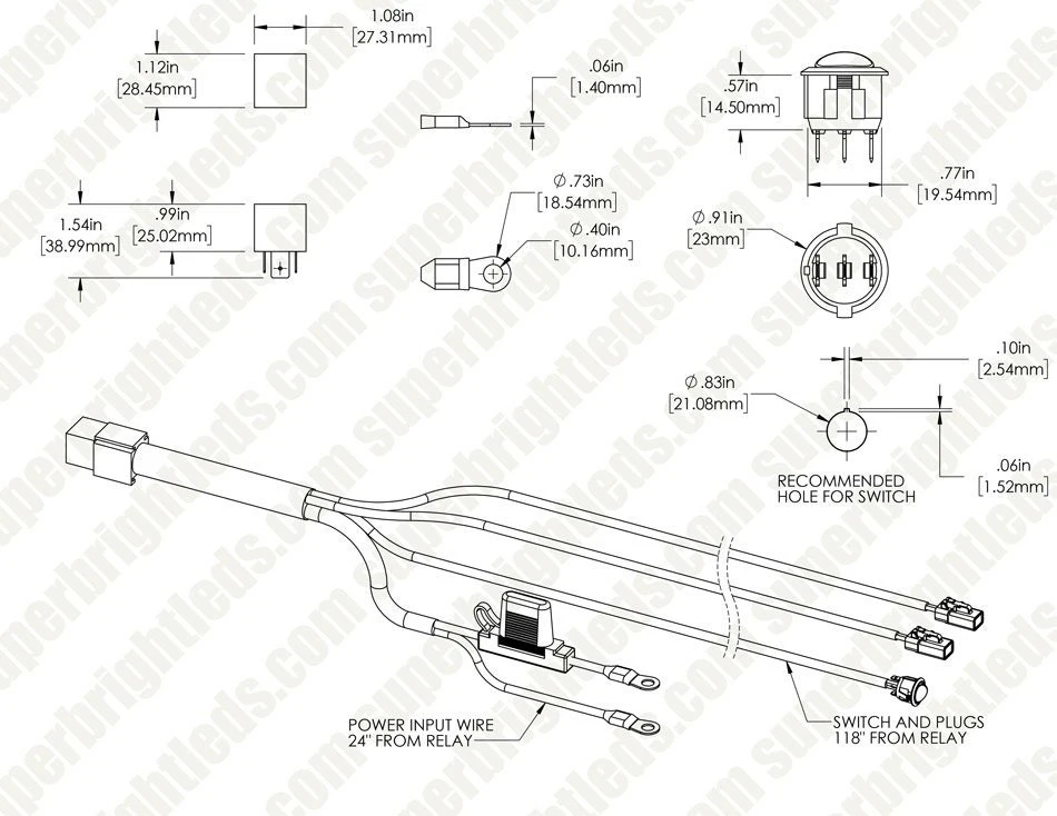 The dual output LED light wiring harness with switch and relay is a complete plug-and-play wire harness for LED work lights and off-road light bars with DTP connectors. The kit includes an On/Off switch with LED indicator light, fuse, automotive relay with solderless spade connections, and DTP pigtail adapters. Kits have a maximum load of 20 Amps (10 Amps per channel). Ideal for installing lights on various vehicles, including but not limited to ATVs, off-road vehicles, and snow plows. Wiring harness is for 12V products only.