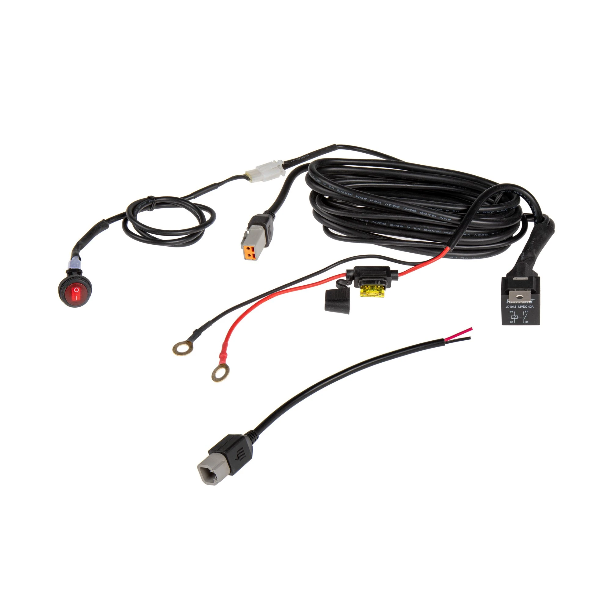 The single-output LED light wiring harness with weatherproof switch and relay is a complete plug-and-play wire harness for LED work lights and off-road light bars with DTP connectors. The kit includes an On/Off switch with LED indicator light, fuse, automotive relay with solderless spade connections, and DTP pigtail adapter. Kits have a maximum load of 15 Amps. Ideal for installing lights on various vehicles, including but not limited to ATVs, off-road vehicles, and snow plows. Wiring harness is only for 12V products.