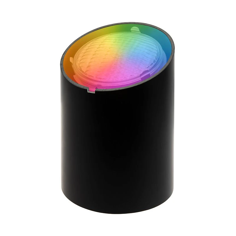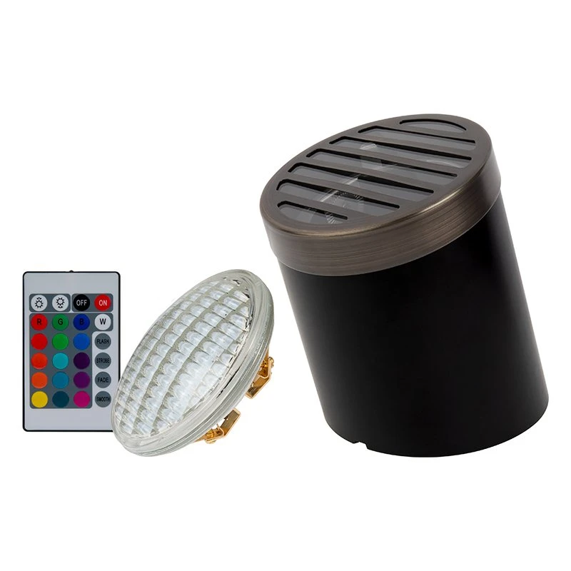 The LED-ready landscape in-ground well light is a versatile and low-profile fixture. The durable polycarbonate body is reversible. Use the angled side or flat side to flush mount. The optional bundle includes an RBG PAR36 bulb with an IP68 weatherproof rating fit for outdoor applications and IR remote control. The spotlight uses a curved lens to deliver an intense beam of colorful or warm white light without hotspots. The IR remote changes the color, adjusts brightness and controls multiple lighting effects. Move the bulb up and down with the adjustable lamp holder for precise lighting. A debris cover, a clear lens with a brass louvered top, and a frosted lens insert are included. Ideal for use in garden, landscape, and architectural uplighting applications.