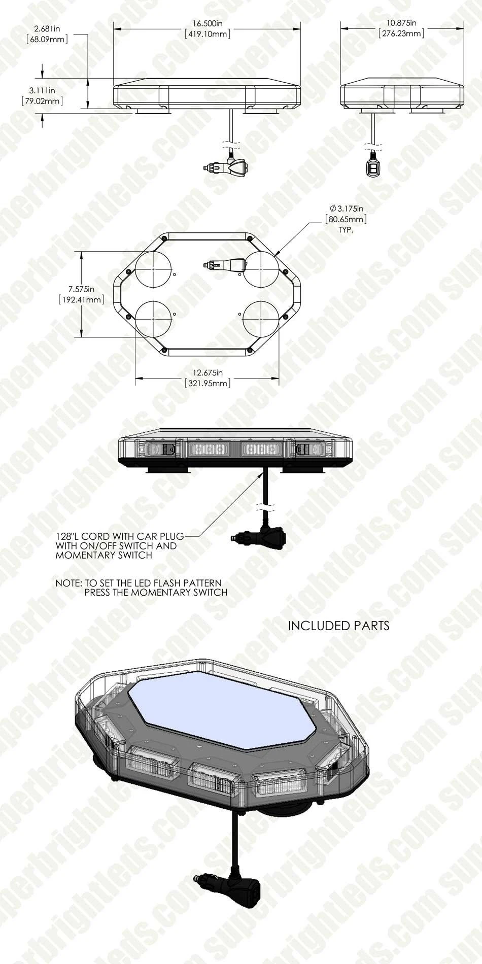 Magnetic mounts allow the STMB series Mini Emergency LED Light Bar to be secured with out drilling into the vehicle. Choose from six selectable flash patterns that can be controlled with the On/Off and mode selection toggle switches, located on the universal 12V accessory plug adapter. Constructed of ABS with shatterproof polycarbonate lenses.