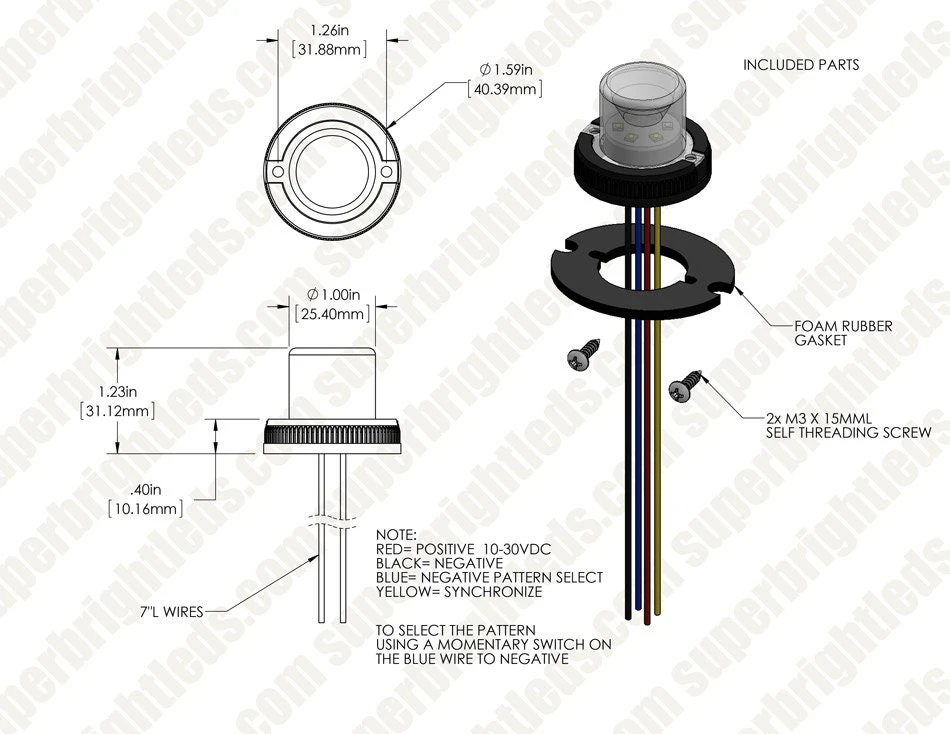 LED Hideaway Strobe Lights provide warning protection for fire, rescue, police, ambulances, or construction vehicles requiring powerful discrete or hidden warning lights. An internal controller delivers 37 strobe patterns. A black aluminum housing with a convex lens and a fully potted circuit board IP67 waterproof rated and corrosion resistant. The lights install easily in headlight or taillight housings via 7″ pigtail wires. Surface or through-hole mountable using two screw holes 1.26″ apart. Available in 360 or 180-degree beam patterns with multiple color options: white, amber, blue, green, and red.