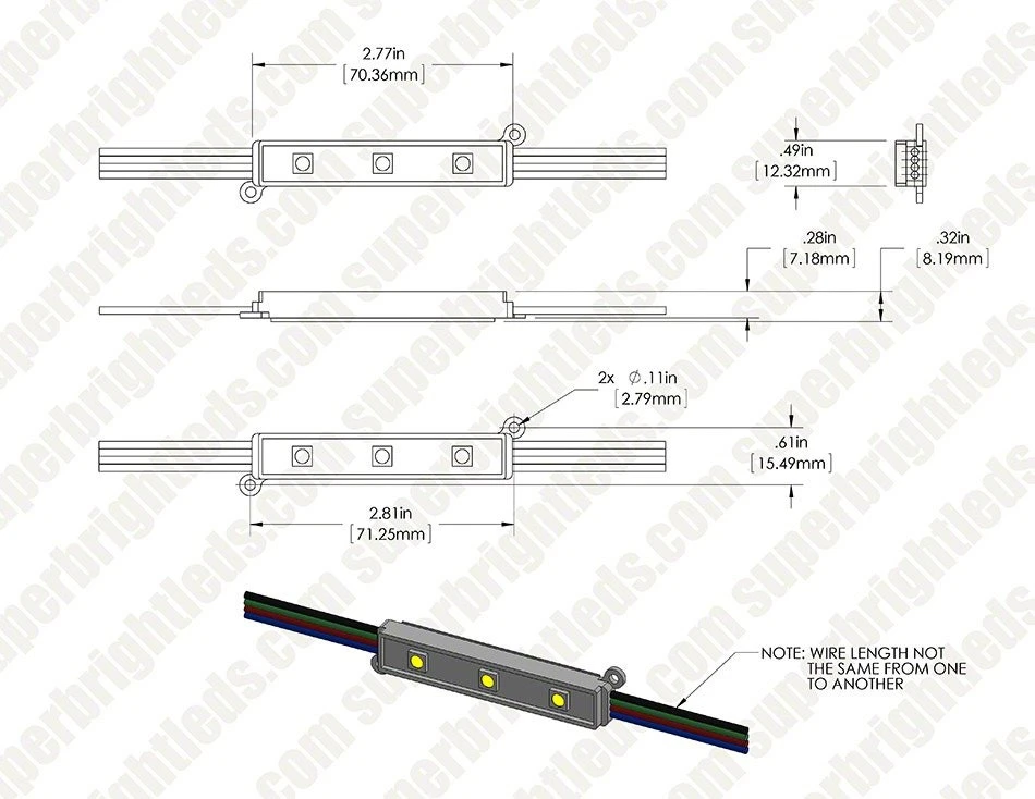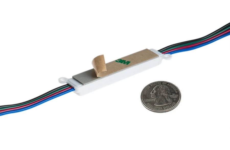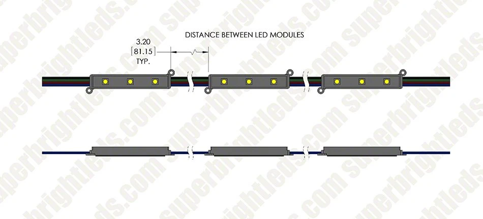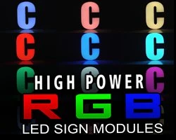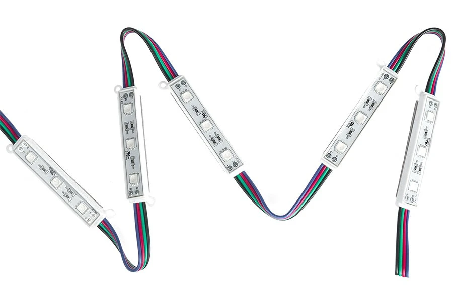 These RGB LED light modules provide consistent illumination for channel letters, sign lighting, under-cabinet lighting, store window lighting, display case lighting, and trade show lighting. Modules are available in 25 packs or 100, stranded together upon purchase. Strands are wired together with 3.20″ spacing between each module (up to 25 modules per strand). Each LED module has 3 LEDs and emits up to 22 lumens. LEDs emit a wide 120° beam pattern that is best suited for illuminating up to 9″ wide channel letters that are as shallow as 3″. The narrow PVC module is injection molded with (2) 0.11″ screw holes for mounting in extreme cold or heat. Double-sided 3M adhesive foam tape is also included for secure mounting. The waterproof module has 12V DC operation and is designed to last 40,000 hours. Choose a compatible RGB controller for color control options.