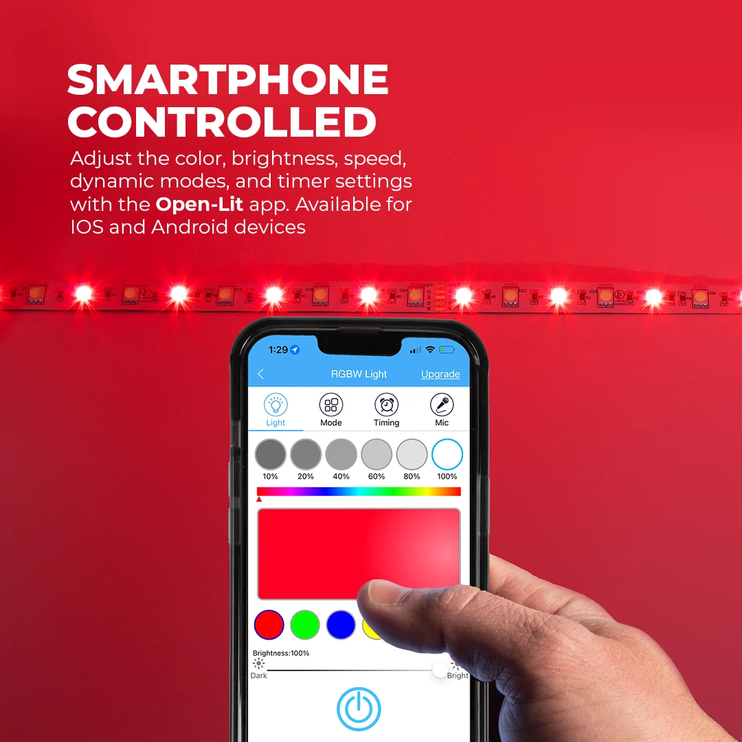 Our in-house lighting specialists developed this LED strip kit with you in mind. Each kit includes everything you need for simple, stress-free installation and use. Use solderless clamps to quickly and safely connect segments of LED strip tape with out the hassle of wire stripping or splicing. Long-lasting 3M™ adhesives ensure easy mounting to virtually any surface. Use the Open-Lit smartphone app and bluetooth controller to customize color modes, brightness, speed, and timer settings. Open-Lit available for iOS and Android devices.