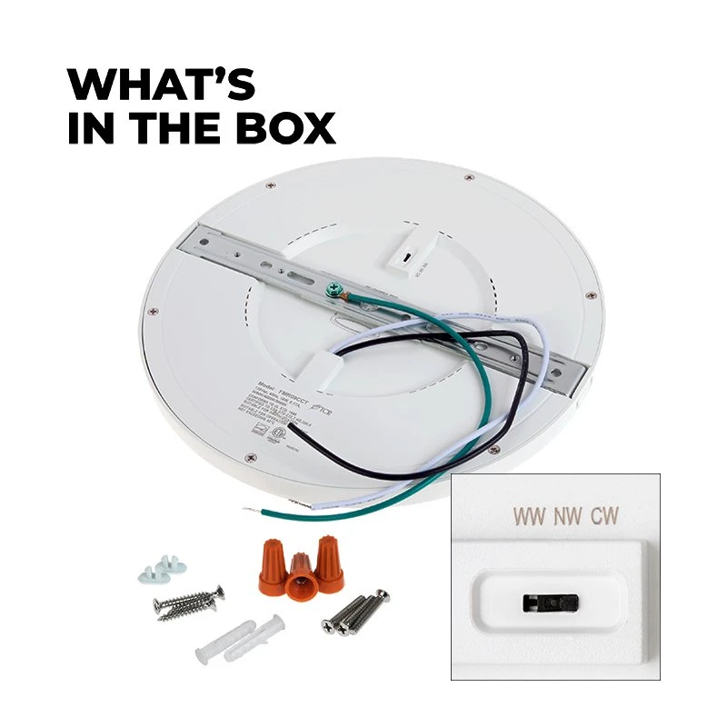 TCP’s 9″ LED Slim Flush Mount Fixtures are perfect for new construction or retrofit projects. They are color selectable and come with a satin nickel magnetic trim ring. The field-selectable CCT allows you to select the color temperature that suits your needs. The frosted lens diffuses the 120° beam angle, producing a uniform light distribution. Install directly to a junction box or within a 5″ or 6″ recessed can. IC Rated for contact with insulation.
