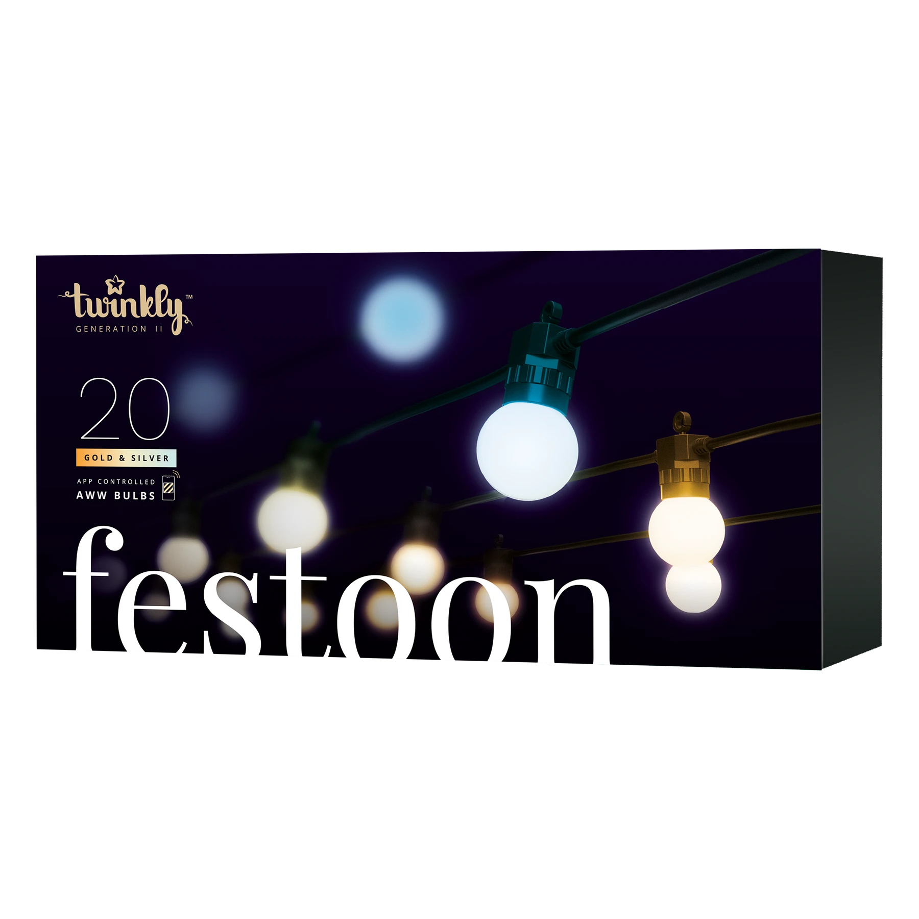 Twinkly Festoon is a smart LED bulb light string that can be controlled with the Twinkly App and vocal assistants. The Festoon Gold & Silver is designed with amber, warm white, and cool white light sources seamlessly set on every single LED. Twinkly Festoon is perfect both for summer and the Christmas season, bringing the most advanced technology to your outdoor lighting decoration. Twinkly Festoon uses a Bluetooth® and Wi-Fi controller with a Twinkly App, allowing you to control each LED individually. Using the app, create your own light design using unique effects, gradients, and color animations, or select from the wide range of pre-programmed effects. Group with other Gold & Silver products by Twinkly for a large, synchronized, light installation.
